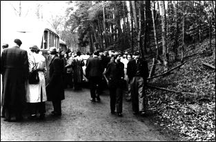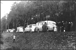 Gegen Mittag tauchen im Pfälzerwald die Omnibuskolonnen auf. Trotz einiger Pannen sind alle Busse zur Stelle. Ihnen folgen kleinere Wagen mit Journalisten. Die Wege werden schwieriger. Oft geht es nur schrittweise voran.