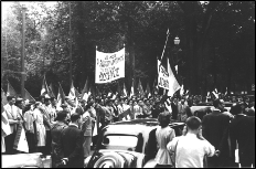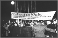 Bei der Ankunft am späten Nachmittag auf dem Straßburger Messeplatz wieder großes Hallo.  Einige Engländer, Spanier und Oesterreicher sind schon mit Fahnen und Transparenten versammelt. In der Halle herrscht lautes Getriebe: Schweizer, Franzosen, Saarländer, Luxemburger, Belgier, Holländer, Dänen. Von hier aus soll es gemeinsam zum Europahaus gehen. Schweigend zieht dann eine Kilometer lange Menschenschlange durch die Straßen, Studenten mit Schärpen, Italiener mit ihren Schnabelhüten, alle äußerst diszipliniert.